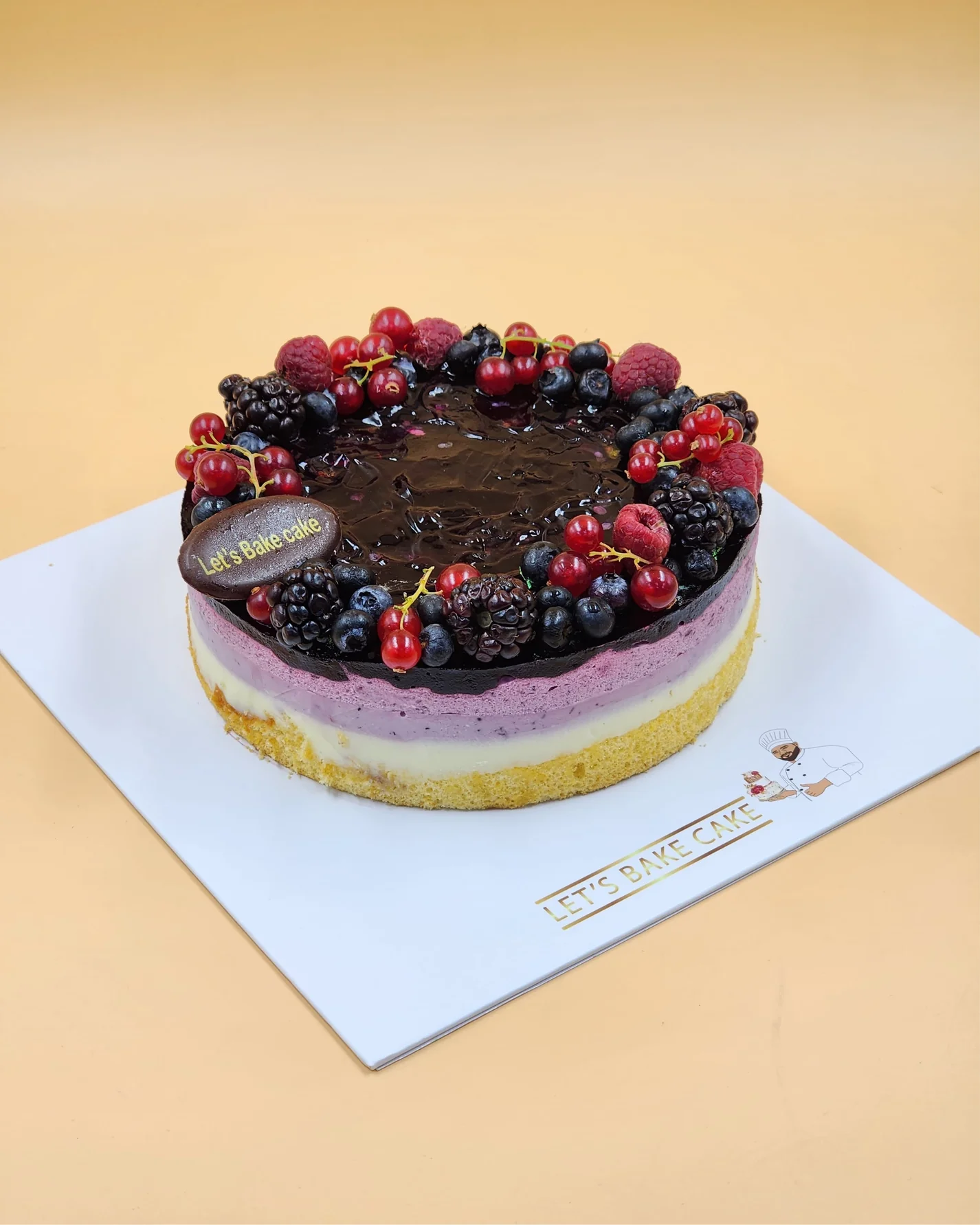 A light, refreshing delight made with layers of velvety vanilla and berry mousse on a soft sponge base. Topped with a glossy berry glaze and an assortment of fresh berries including raspberries, blueberries, blackberries, and red currants – every bite bursts with natural flavor.